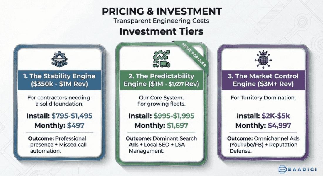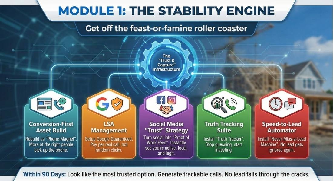 - We secure your territory, audit your current website, SEO, Google Ads, and LSA setup, then build the HB‑optimized website, service area pages, and review systems.