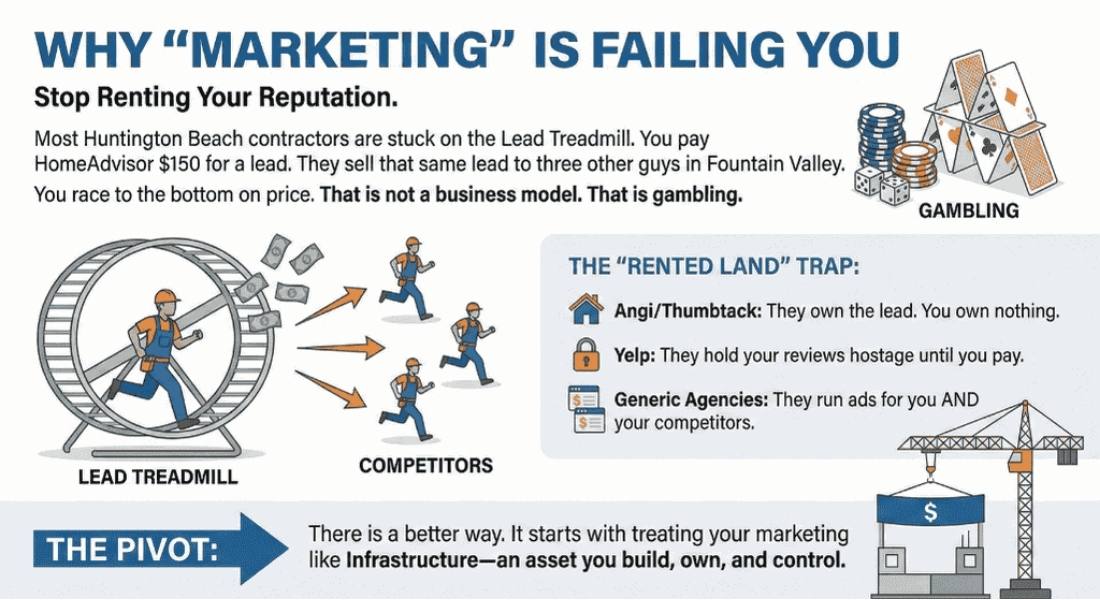 Most Huntington Beach contractors are stuck on the Lead Treadmill. You pay Angi or HomeAdvisor 150–300 per lead, they sell that same homeowner to three or four other contractors in Fountain Valley or Costa Mesa, and you race to the bottom on price. That is not a business model. That is gambling.