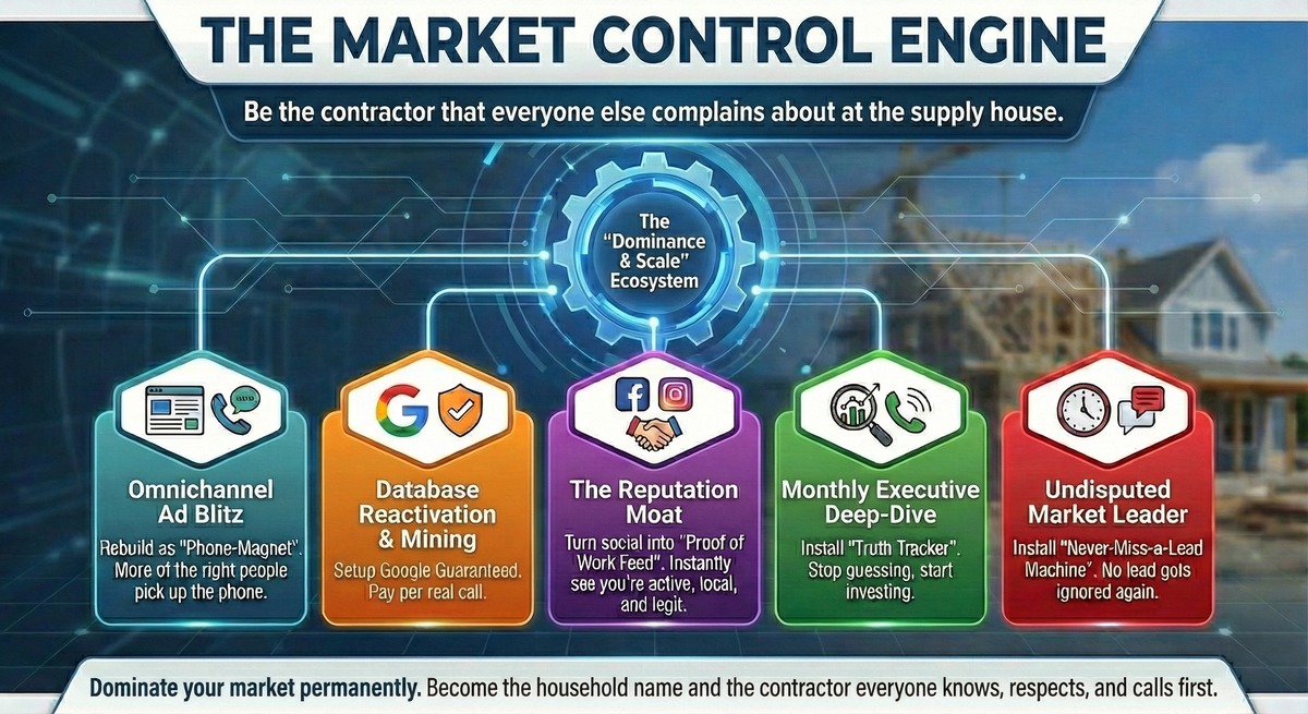 The Market Control Engine™ is a dominance-building system for top-tier contractors who want to own their market, maximize customer lifetime value, and make it nearly impossible for competitors to keep up.