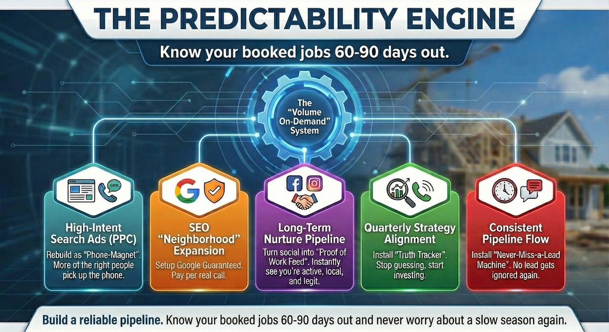 The Predictability Engine™ is a high-performance digital growth system for $1M–$3M contractors who already have the crews — but need a consistent, exclusive flow of high-quality leads to keep the calendar full year-round.