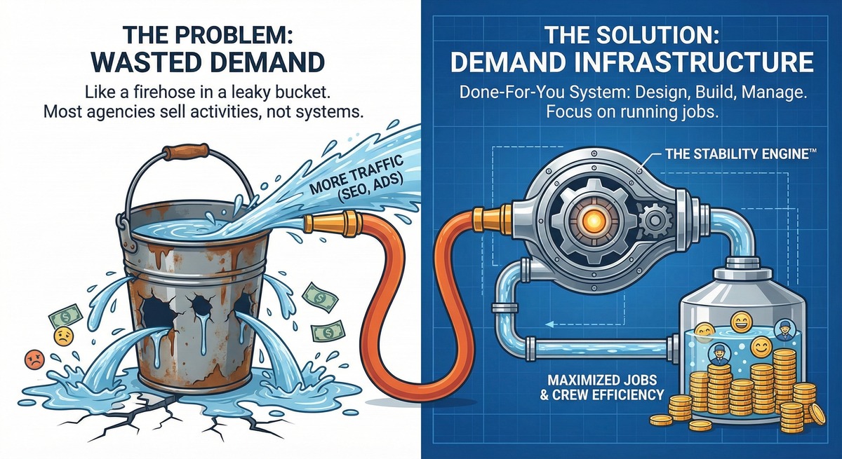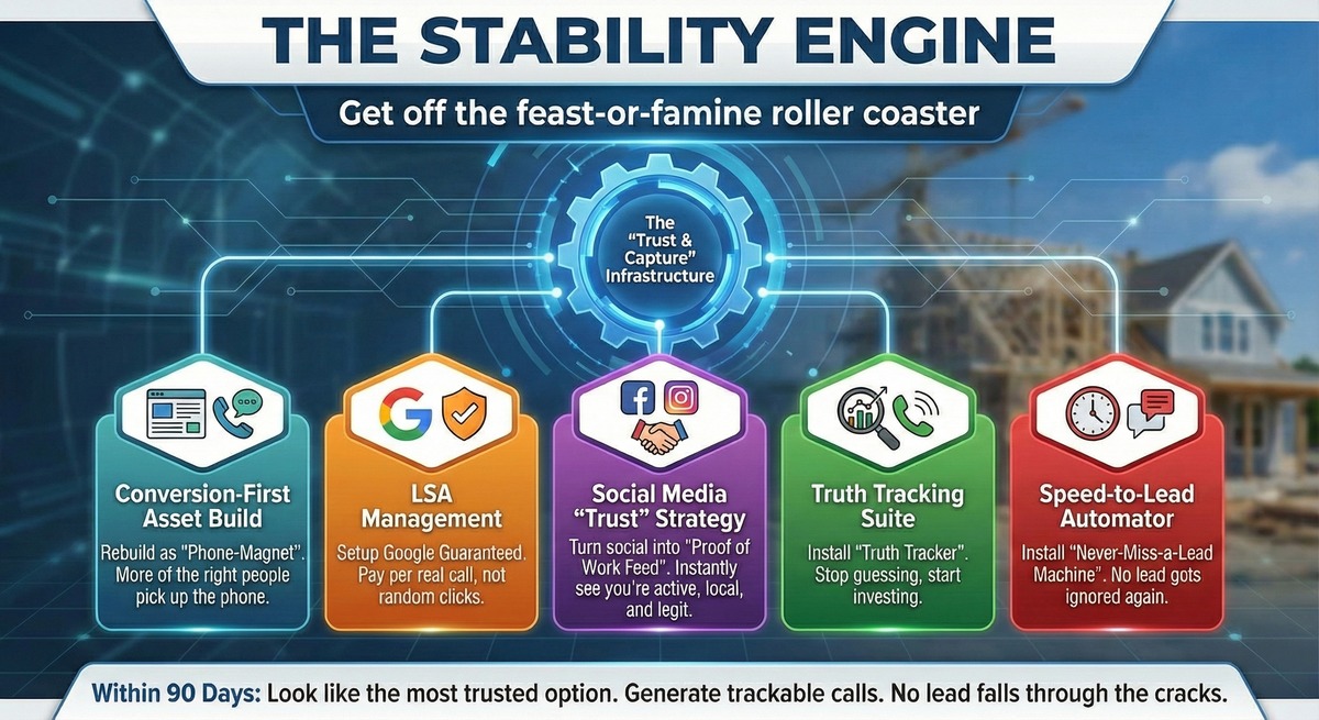 The Stability Engine is the digital infrastructure built for contractors who are tired of “hope marketing” and ready for steady, trackable calls from real homeowners.