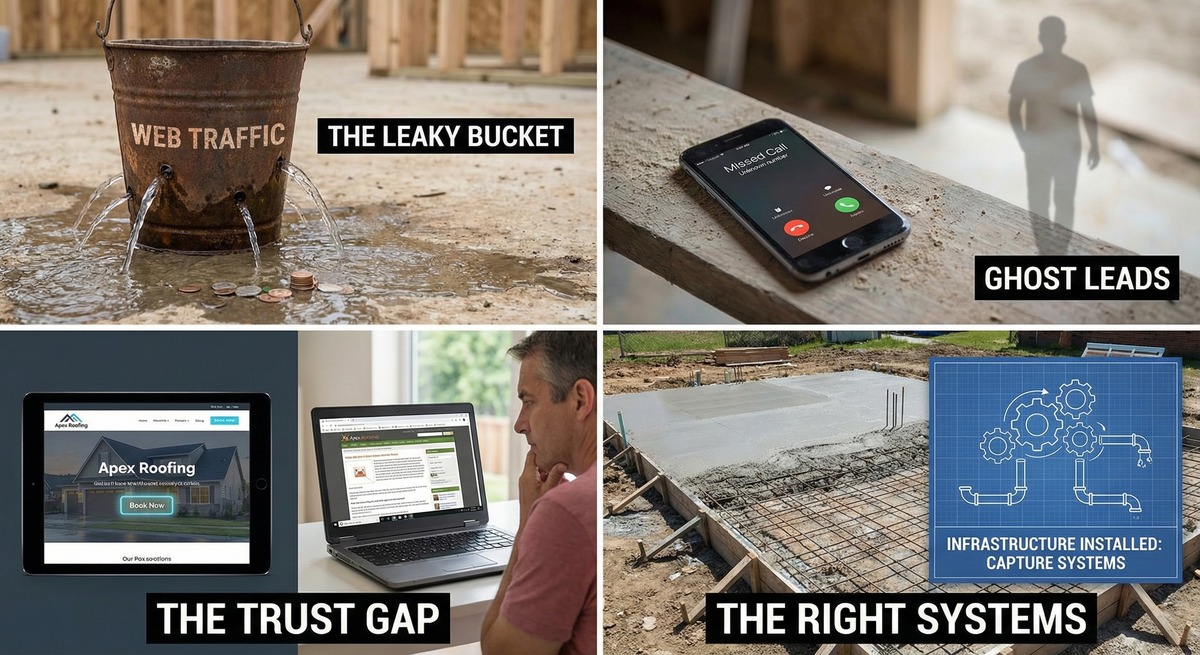 Most agencies try to sell you "more traffic" (SEO, Ads) before you are ready to handle it. That is like turning on a firehose with a leaky bucket.