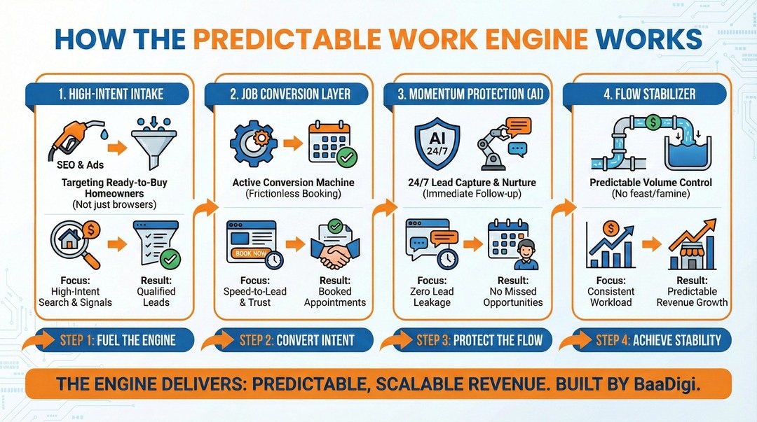 Predictable Work Engine is engineered for Owner-Operator and Small Crew Contractors (Roofers, Plumbers, HVAC, Remodelers) who are tired of the "feast or famine" revenue cycle. It is not for companies looking for "brand awareness" or "likes." It is for companies that need booked appointments.