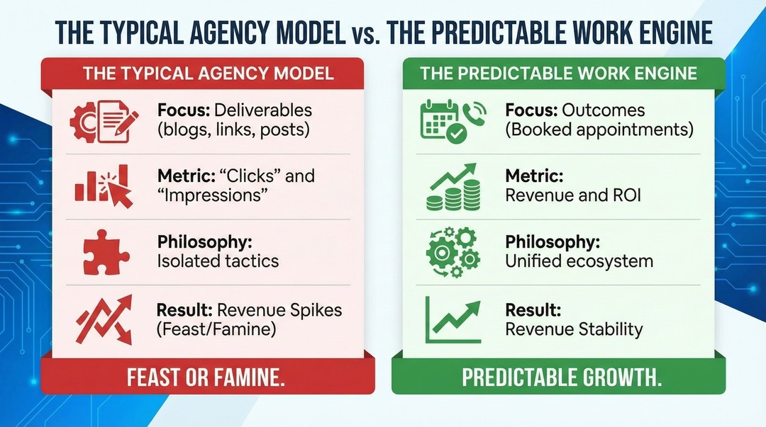 No. Agencies sell "services" (like SEO or social media posts) and charge you a retainer regardless of the result. We are System Builders. We install a complete operational infrastructure—The Predictable Work Engine™—into your business. Our goal isn't to sell you ads; it is to fix your lead leakage and install a permanent flow of booked work.