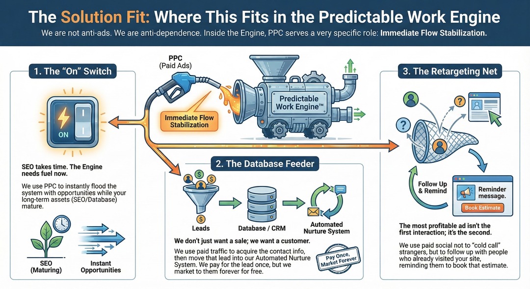 For most contractors, Pay-Per-Click (Google Ads/Facebook) feels like a rollercoaster. You turn the ads on, the phone rings, and your bank account drains. You turn the ads off, the phone stops, and the crew stands around.